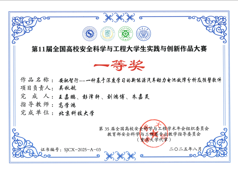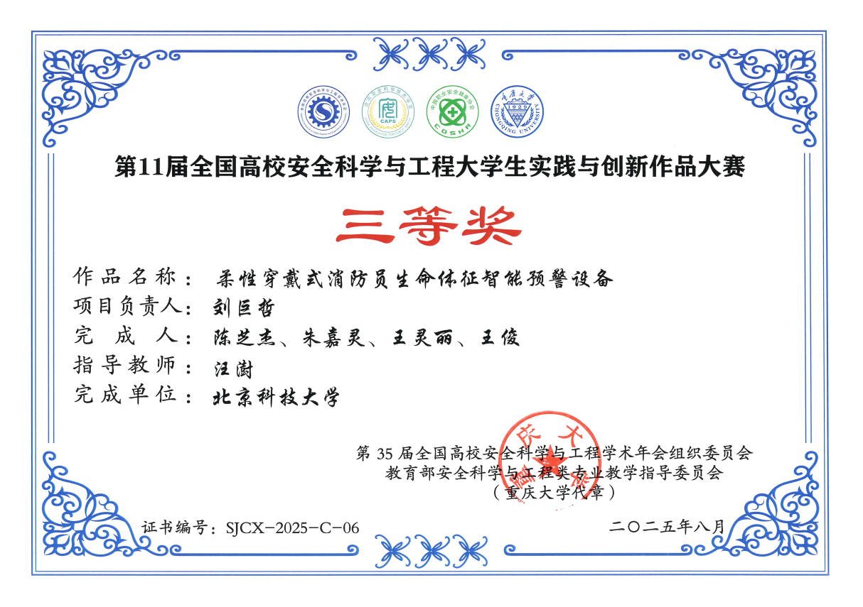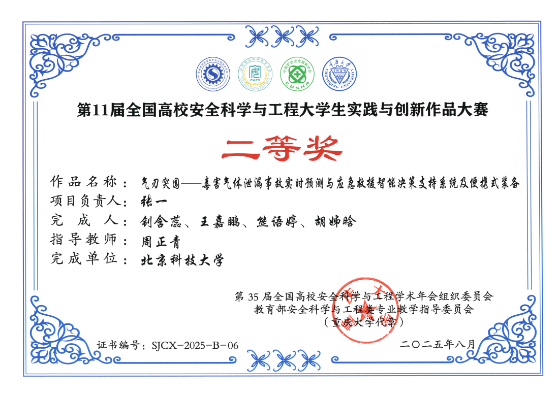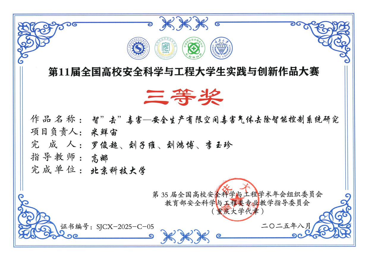 所获奖项:第11届全国高校安全科学与工程大学生实践与创新作品大赛国家级二等奖;