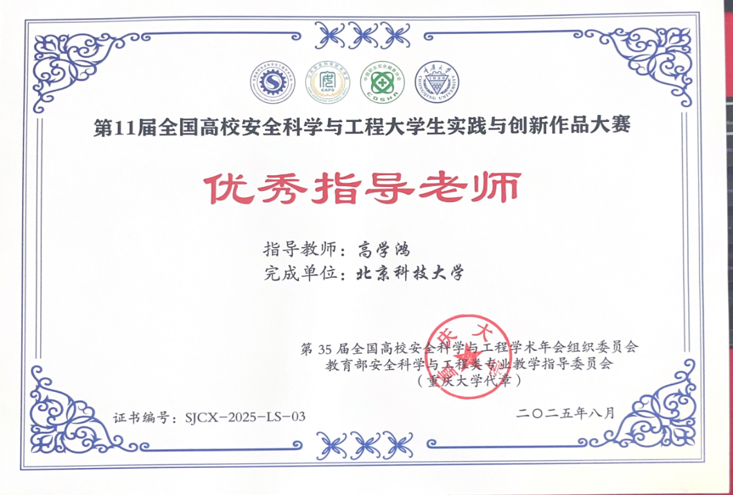 2025年度第11届全国高校安全科学与工程大学生实践与创新作品大赛总决赛于7月17日至7月18日在重庆市沙坪坝区重庆大学举办。在10月19日,第11届全国高校安全科学与工程大学生实践与创新作品大赛决赛成绩揭晓,我院安全学科学生代表队再创佳绩、满载而归!